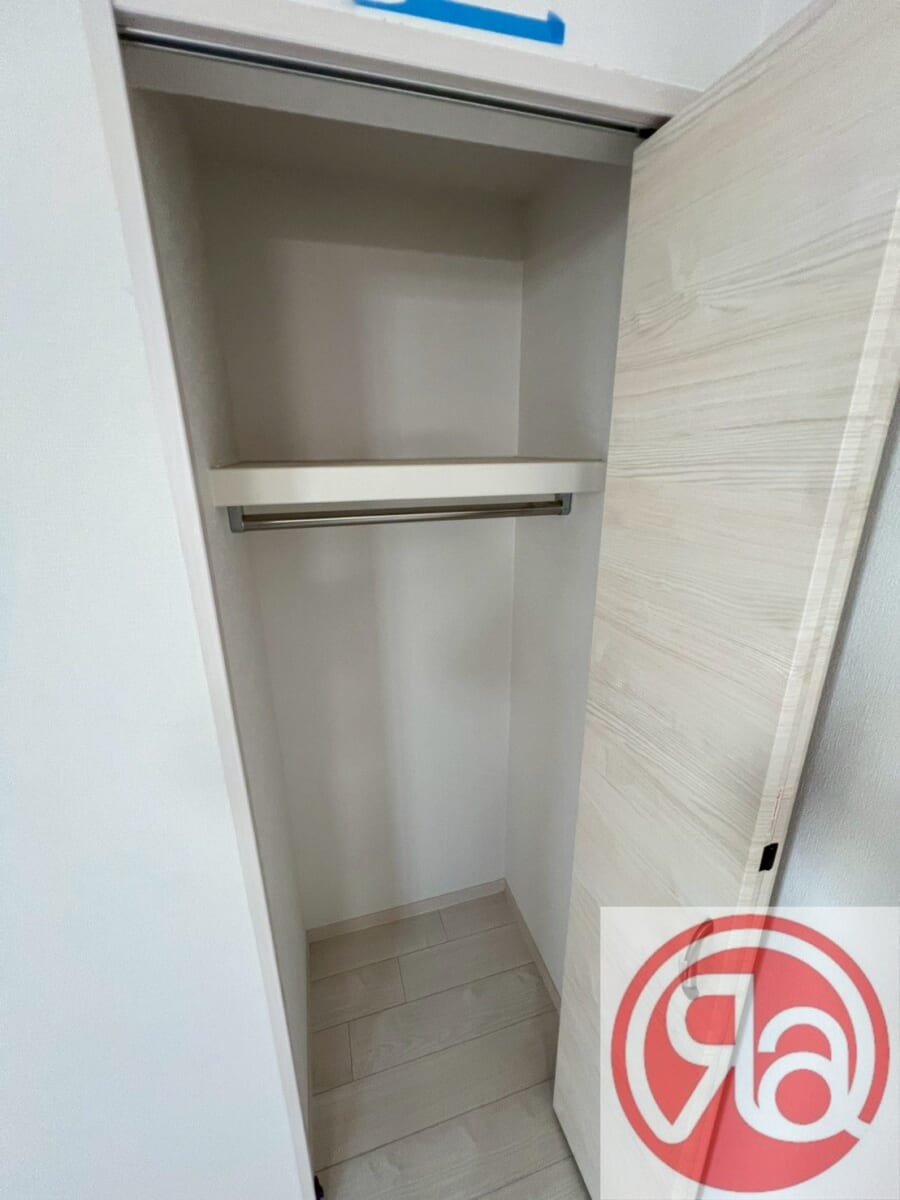 DKに設置されたクローゼットはコンパクトですが、ハンガーラッグ付きで、シャツ類はしわなくかけることができます。入りきらないオフシーズンの衣類はボックス収納やベッド下収納などで補うのがおすすめ。限られたスペースを有効活用することで、スッキリとした暮らしが実現します。