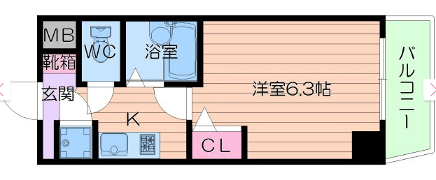 6.3畳の洋室は、大きな柱などがなく、ベッドやソファを配置してもゆとりのある空間です。白を基調とした明るい内装は、どんなインテリアでも相性がよく、自分らしいコーディネートを楽しめます。初めての一人暮らしや単身者にとって程よい広さで、プライベート時間を心地よく過ごせる設計です。