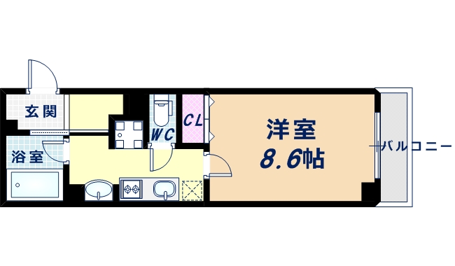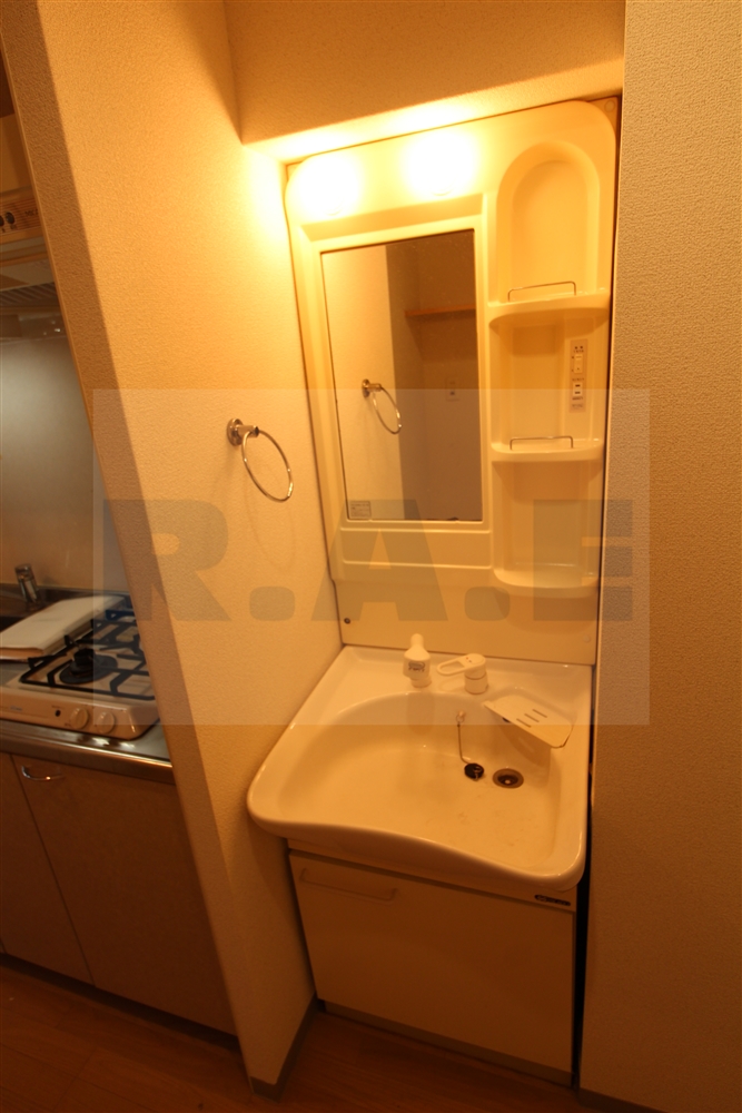 脱衣室は設けられていませんが、キッチン横に独立洗面台が配置されています。その目の前には洗濯機置き場もあり、限られたスペースを効率的に使える設計です。朝の支度や帰宅後のルーティンがスムーズに行える工夫が施されており、一人暮らしにはむしろ使い勝手の良いレイアウトです。