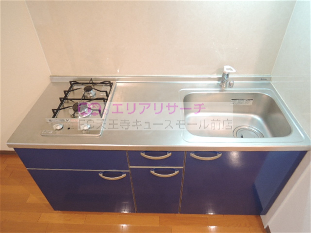 キッチンはコンパクトながら使い勝手を重視した設計で、縦型2口ガスコンロを完備。調理スペースも確保されており、自炊派の方にも嬉しい環境です。上下に収納スペースがあり、食器や調理器具を整理しやすく、作業効率が上がります。キッチン周りはお掃除も簡単で、常に清潔な状態を保てます。