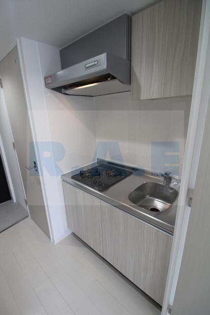 1Kタイプでも無理なく使えるコンパクトキッチンは、2口IHコンロ付きで料理の幅も広がります。上部収納は最小限ですが、キッチン周りに棚やラックを置けるスペースが確保されており、食器や調味料を効率的に整理可能です。白を基調とした清潔感あるデザインで、毎日の料理が楽しくなる空間です。料理初心者の方でも、シンプルな動線でスムーズに料理ができる工夫が施されています。
