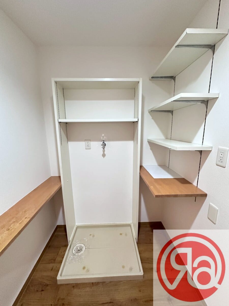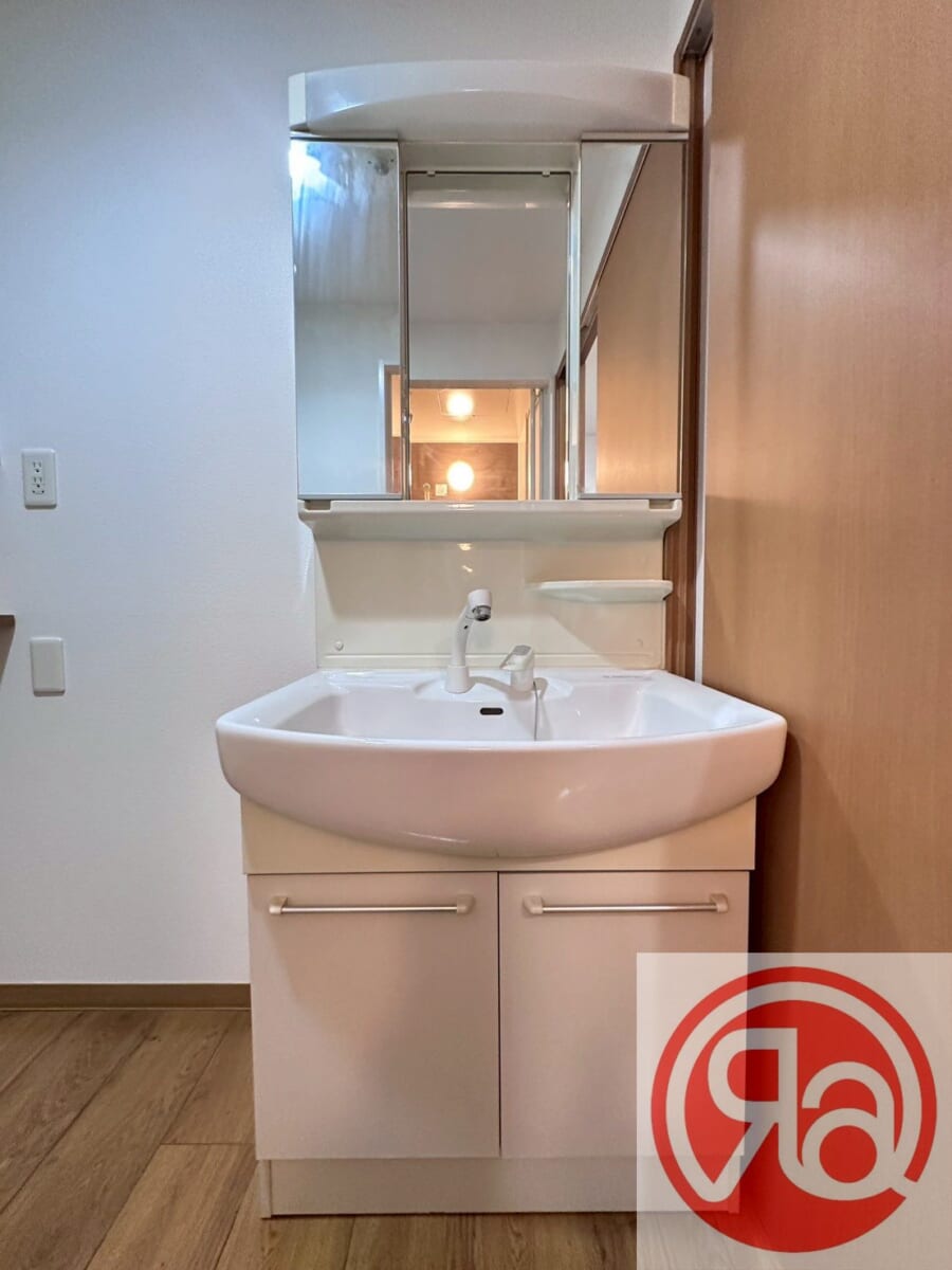 リノベーション済みの脱衣室には、独立洗面台と洗濯機置き場が設置されており、朝の身支度や洗濯もスムーズに行えます。洗濯機置き場の横には収納棚も備わっており、洗剤やタオル、掃除用品などをすっきり整理可能。コンパクトながらも使い勝手を考えた配置で、生活動線が効率的に設計された快適な空間です。