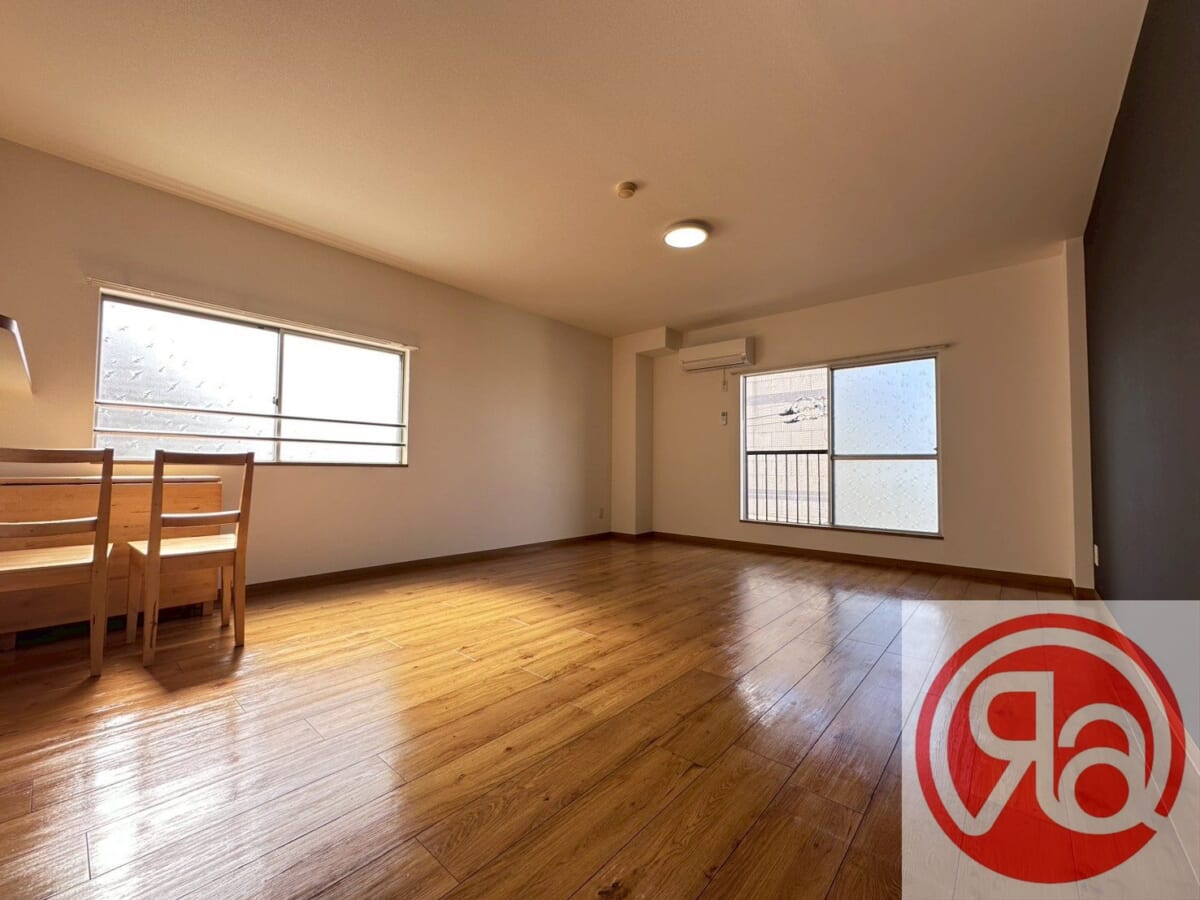 リノベーション済みの広々ワンルームは13畳あり、西向きの大きな窓からは午後の柔らかい陽射しが差し込みます。木目フローリングと内装が落ち着いた雰囲気で調和し、どんなインテリアとも相性がよく家具の配置も自由自在です。ワンルームながら空間の広さを活かしたレイアウトで、ソファやデスクを置いてもゆとりがあります。角部屋で2面から自然光が入るため、昼間は照明をほとんど使わず快適に過ごせます。