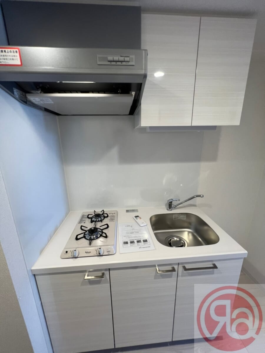 キッチンはコンパクトながら使い勝手を重視した設計で、縦型2口ガスコンロを完備。調理スペースも確保されており、自炊派の方にも嬉しい環境です。上下に収納スペースがあり、食器や調理器具を整理しやすく、作業効率が上がります。キッチン周りはお掃除も簡単で、常に清潔な状態を保てます。