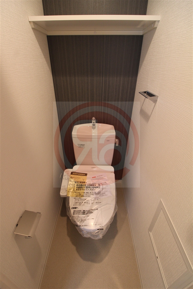 独立タイプのトイレは、温水洗浄便座付きで機能性も高く、清潔感のある快適な空間に仕上がっています。シンプルでありながらも生活に欠かせない設備がしっかり整っており、来客時にも安心です。頭上にある収納棚は、トイレットペーパーや掃除用品、ストック類などをすっきりと隠せるため、生活感を出さずに美しく保てます。