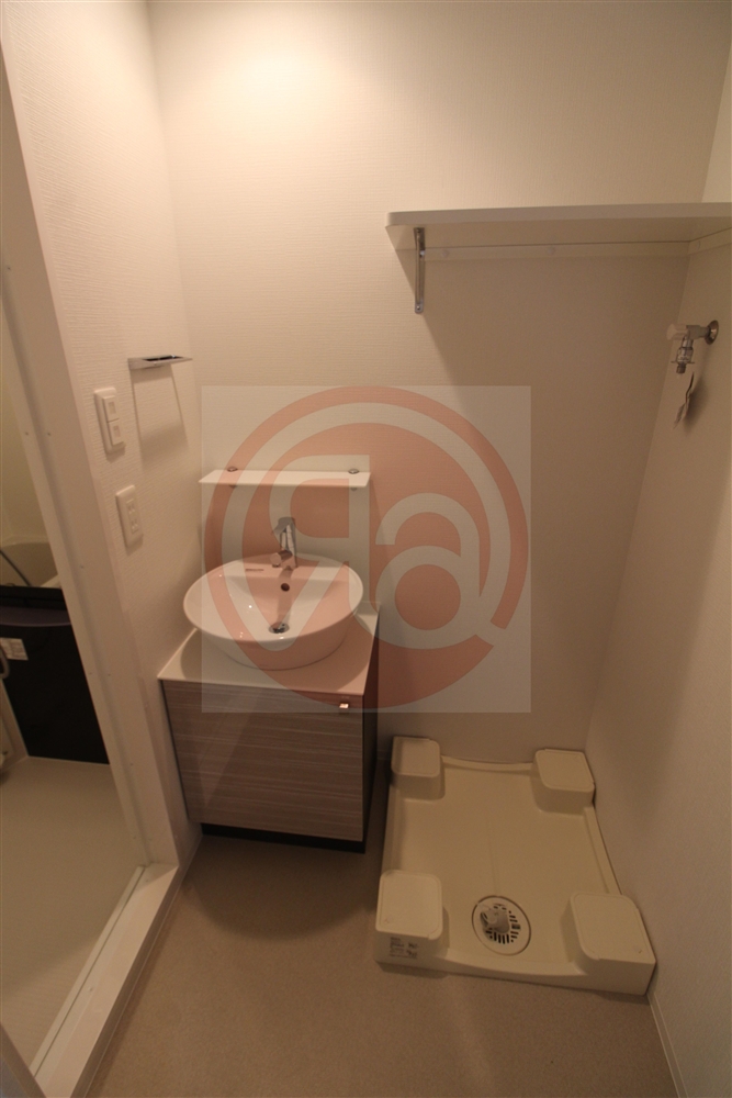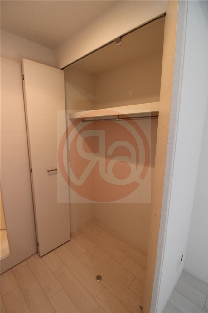 洗濯機置き場の上には収納棚が設置されており、洗剤やタオル類をきちんと整理できます。
