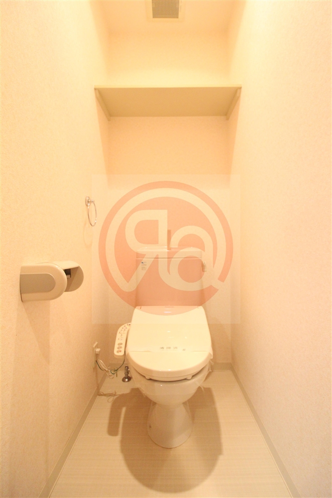 トイレは、温水洗浄便座付きで機能性も高く、清潔感のある快適な空間に仕上がっています。シンプルでありながらも生活に欠かせない設備がしっかり整っており、来客時にも安心です。頭上にある収納棚は、トイレットペーパーや掃除用品、ストック類などをすっきりと隠せるため、生活感を出さずに美しく保てます。
