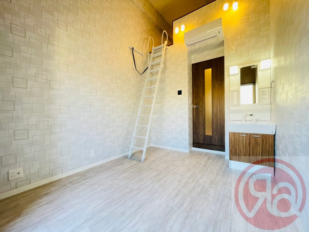 メインの洋室は6畳で天井が高めに設計されているため、数字以上のゆとりを感じられるのが特徴です。視線が縦に抜けることで、圧迫感がなく、初めての一人暮らしでも広々とした印象に。ベッド・デスク・テレビボードなど、生活の基盤を作る家具を置いても動線を確保しやすく、ミニマルにもこだわり派にも対応できる使いやすいレイアウトです。階段感覚で上がれるロフトは5畳あり、1Kとは思えない“+1部屋”の感覚を楽しめます。天井高めの構造と相まって狭さを感じにくく、寝室として利用すれば、下のフロアが自然とリビング空間になります◎