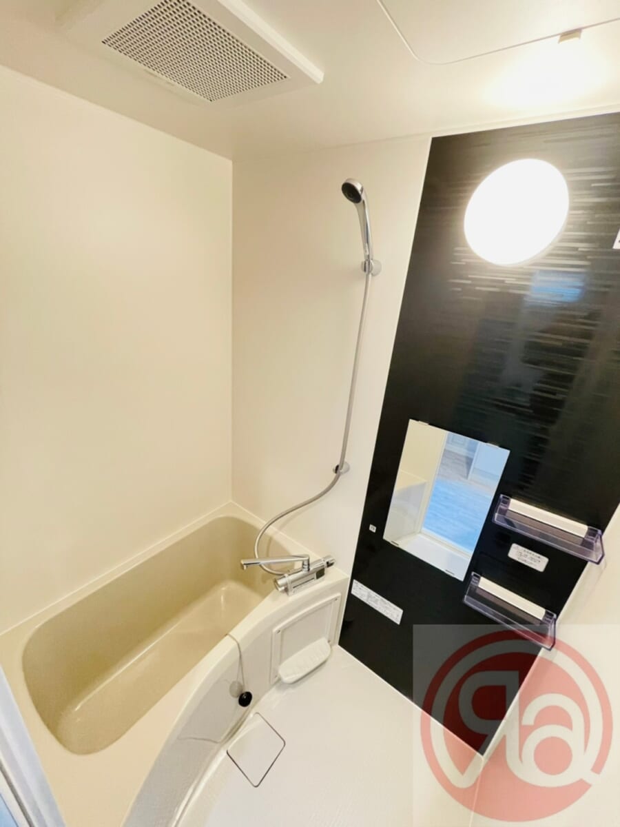 浴室は清潔感のあるホワイトとブラックのアクセントウォールで、毎日のバスタイムがリラックスできる空間です。浴槽はコンパクトながら足を伸ばして入れる広さがあり、シャワーとの切り替えも簡単。シンプルで無駄のない造りになっており、毎日の入浴を快適にサポートしてくれます。掃除もしやすく、清潔感を保ちやすい点が魅力。浴槽は一人暮らしにちょうど良いサイズ感で、肩までしっかり浸かれます◎