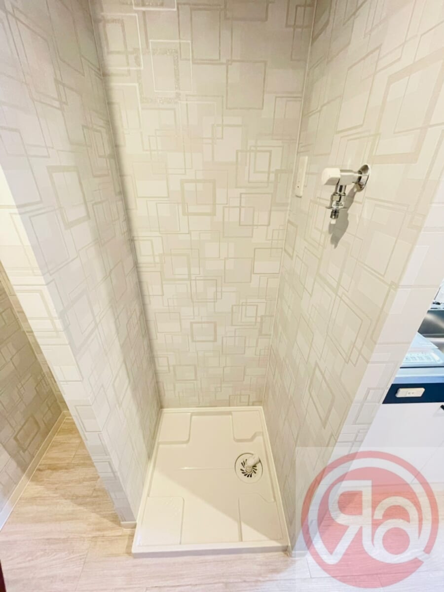 脱衣室は設けられていませんが、バスルーム前のキッチン横に洗濯機置き場を配置。動線が短く、家事の効率が良いレイアウトになっています。料理をしながら洗濯機を回すこともできるため、限られた空間を上手に活用できるのがポイントです。室内に洗濯機を設置できるので、雨の日でも安心して洗濯でき、清潔な暮らしをキープできます。無駄のないコンパクト設計ながら、生活のしやすさをしっかり考えられた造りです◎