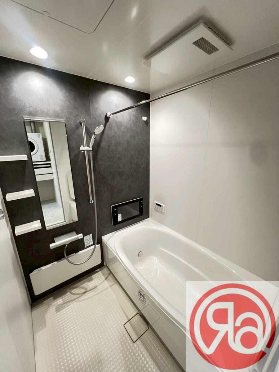 バスルームには、くつろぎ時間をぐっと豊かにしてくれる浴室TVを搭載しているので、お気に入りの番組や音楽を楽しみながらゆっくり浸かれば、毎日の疲れもやさしくほぐれていきます。さらに、バスタブは足を伸ばしてゆったり入れる広めのサイズで、深さ・長さともにしっかり確保されているため、半身浴も全身浴も快適。お子さまと一緒に入浴する際も余裕を感じられる、ファミリー向けの使いやすい設計です。1日の終わりに“自宅がまるでスパのように感じられる”心地よいバスルーム空間が整っています◎