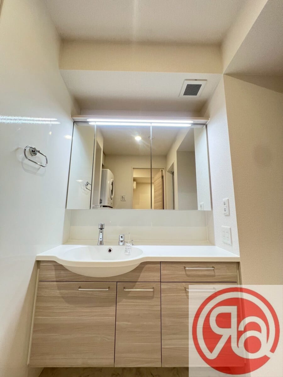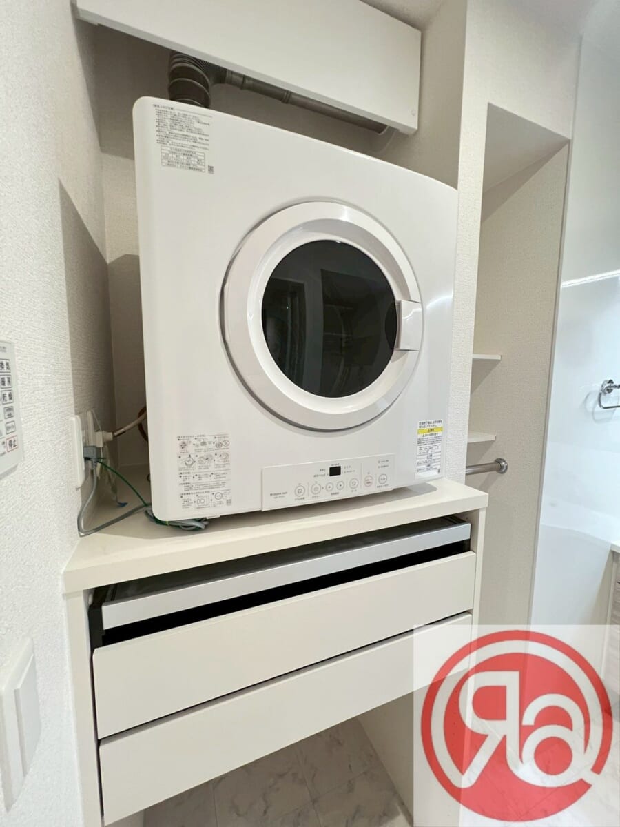 脱衣室には、毎日の家事をしっかりサポートしてくれる備え付けの乾燥機を完備しているので、天候に左右されず洗濯物を乾かせるため、忙しいファミリー世帯にとって頼もしい設備です。乾燥機の下には引き出しタイプの収納があり、タオル類や洗濯用洗剤、ストック品をすっきり整理できる使い勝手の良さも魅力です。空間自体もゆったりとした広さが確保されており、着替えや身支度の動作がしやすく、家族で使っても窮屈さを感じません。機能性と快適さの両方を備えた、気持ちよく使える脱衣室です◎
