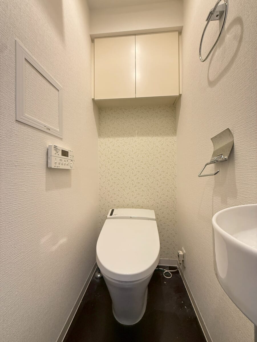 トイレには温水便座が設置されており、季節を問わず快適に使用できるのが魅力。毎日使う場所だからこそ、機能面がしっかり整っている点は安心感につながります。室内は白を基調とした清潔感のある空間で、明るくすっきりとした印象。お手入れもしやすく、常に気持ちよく保てる設計です。来客時にも好印象を与えてくれる、住まい全体の質を高めるトイレ空間となっています◎