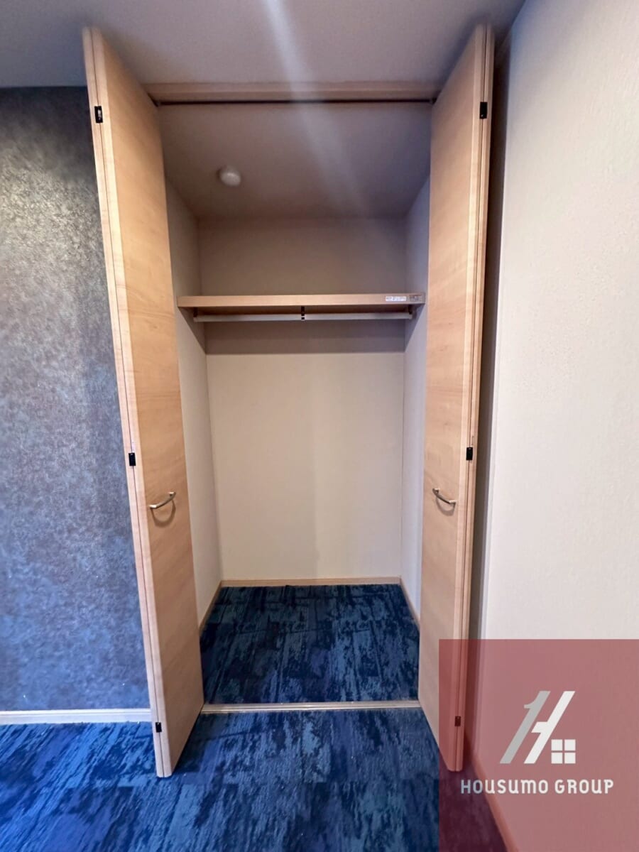 収納は洋室に設けられたクローゼットタイプで、横幅はコンパクトながら、しっかりとした奥行きが確保されているため、見た目以上の収納力があります。ハンガーパイプを活かして衣類をまとめて掛けられるほか、奥行きを利用して収納ケースやボックスを併用すれば、季節物やバッグ類も効率よく整理可能です。「広さ」よりも「使い方」を意識した設計で、収納スペースが生活動線を圧迫しない点もポイント。ロフト付きの1LDKという間取りと組み合わせることで、日常使いの衣類は洋室収納へ、使用頻度の低い物はロフトへと役割分担ができ、室内全体をすっきりと保てます。