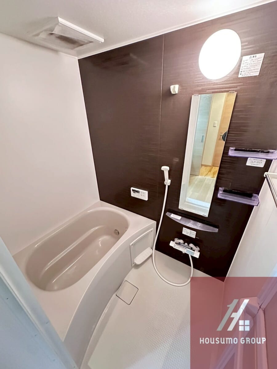 バスルームは一日の疲れをリセットするための空間として、機能性とデザイン性の両立を重視。室内の一面にはブラウンのアクセントウォールを採用し、ホテルライクで落ち着いた雰囲気を演出しています。白基調の浴室にありがちな無機質さを抑え、視覚的にもリラックスできる空間に仕上がっています。また、追い炊き機能付きのため、帰宅時間が不規則な方や、ゆっくり湯船に浸かりたい方にも安心。お湯の温度を気にせず、好きなタイミングで快適なバスタイムを楽しめます。単身用から一歩進んだ設備仕様で、1LDKならではの“暮らしの質”を感じられるポイントです。
