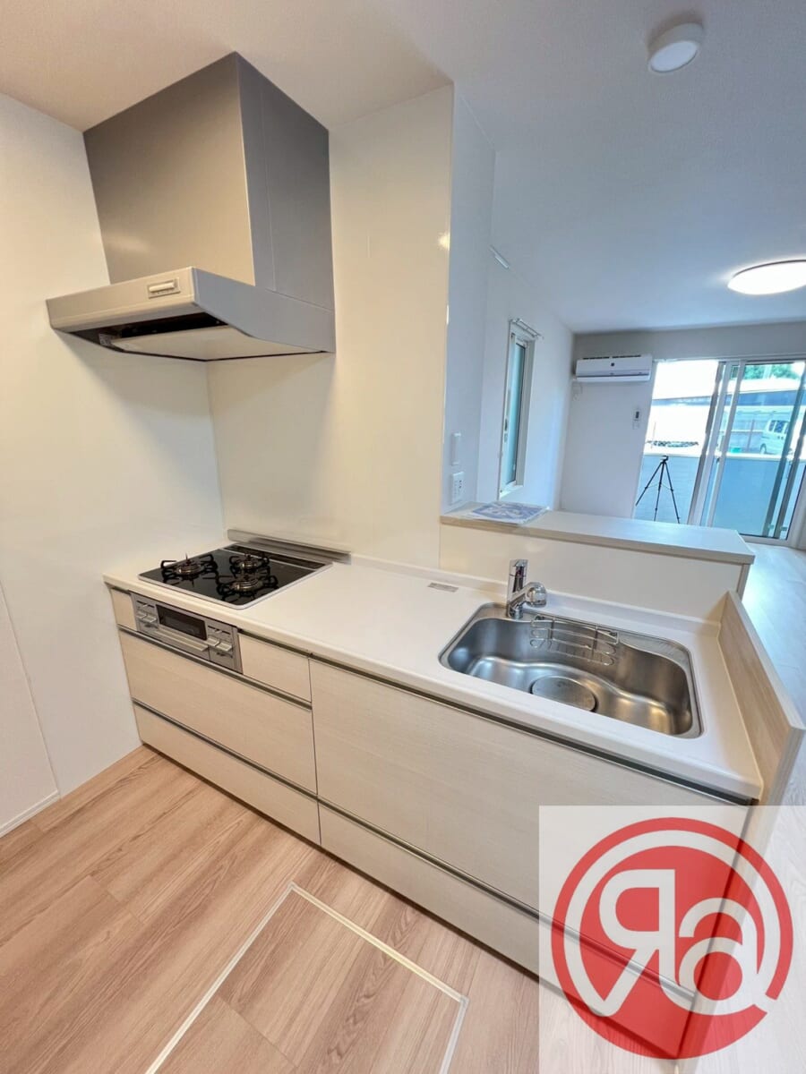 LDK中央に配置されたキッチンは、動線を意識した使いやすいレイアウト。リビングの様子を見渡しながら調理ができるため、会話を楽しみたい方にもおすすめです。収納スペースも確保されており、調理器具や食器類をすっきり整理可能。日々の料理がストレスなくこなせる、実用性の高いキッチンです。