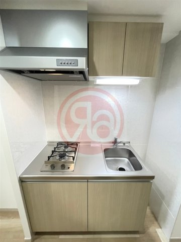 キッチンは二口ガスコンロ付きのシステムキッチンで、自炊や同時調理にも対応できる使い勝手の良い仕様です。作業スペースとシンクがしっかり確保されており、調理から片付けまでスムーズに行えます。上下収納付きで、調理器具や食器を整理しやすく、生活感を抑えた空間を保てる点も魅力です。居室と程よく分かれた配置で、においや煙が広がりにくい実用的なキッチンスペースです。