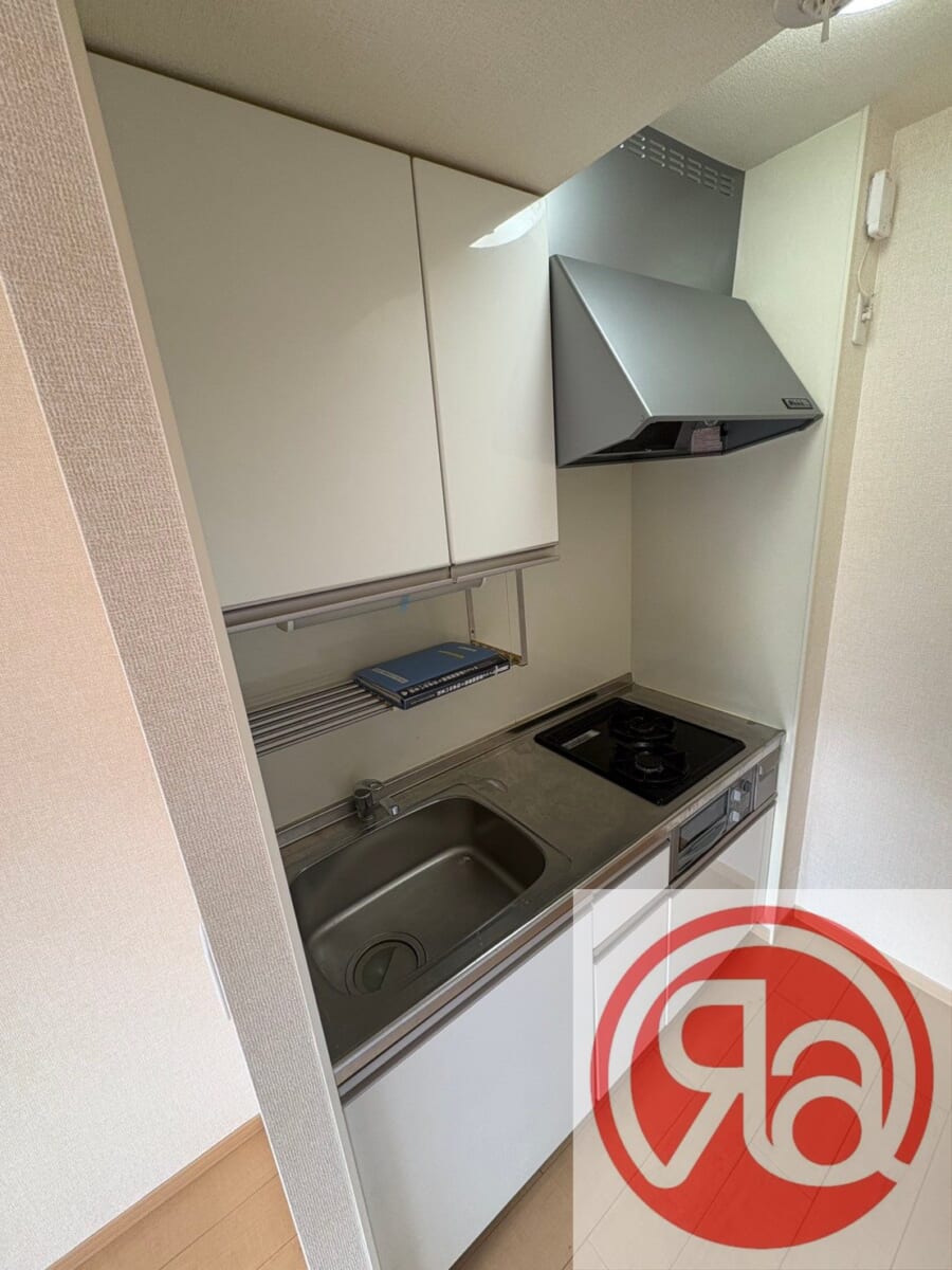 コンパクトながら二口ガスコンロ付きで、日常の調理に対応できるキッチンです。シンクと作業スペースが確保されており、下ごしらえや洗い物もしやすい設計になっています。上部・下部収納が備わっているため、調理器具や食器を整理しやすい点も魅力です。レンジフード付きで、調理中のにおい対策にも配慮されています。限られたスペースを有効活用できる、実用性の高いキッチンです。