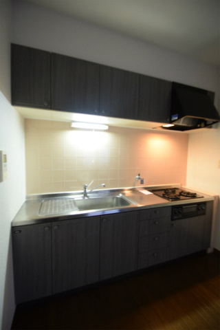 落ち着いたダークグレーのパネルが洗練された印象を与えるシステムキッチンです。調理スペースをしっかりとはさんで、一度に複数の料理を効率よくこなせる3口のガスコンロが設置されています。シンクは洗い物がしやすい広さがあり、水切りプレートも備わっているため、使い勝手も良好です。また、手元を明るく照らす照明に加え、上下には豊富な収納スペースが完備されており、調理器具や食器類、ストック品などを分類してスマートに整理できます。壁面には掃除がしやすいタイル調のパネルが採用されており、日々のお手入れも簡単に行える機能的な空間となっています。