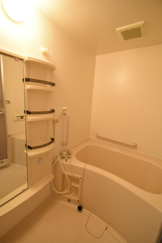 バスルームは、優しく温かみのあるオフホワイトで統一された、清潔感のある空間です。ゆったりと肩まで浸かれる広い浴槽には手すりが設置されており、どなたでも安全に入浴できるよう配慮されています。壁面にはシャンプーやボディソープなどを整理して置ける、3段の便利な収納棚が完備されています。また、大きな鏡も設置されているため、機能的で使い勝手の良い設計となっています。毎日の疲れをリラックスして癒やすことができる、心地よいバスタイムを提供してくれる場所です。