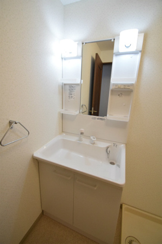 脱衣所は、白を基調とした壁紙に囲まれた清潔感のある空間です。独立洗面台はシャワー付きの洗髪洗面化粧台となっており、忙しい朝の身支度もスムーズに行えます。鏡の左右には、歯ブラシや化粧品などの小物を整理して置ける収納ラックが充実しているほか、手元を明るく照らす照明も完備されています。洗面台の横には室内洗濯機置き場が確保されており、さらに防水パンも設置されているため、万が一の漏水時にも安心です。家事動線が考慮された使い勝手の良いレイアウトにより、日々の生活を快適にサポートしてくれます。