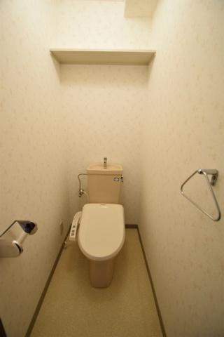 トイレは、淡い花柄の壁紙が優しい雰囲気を演出する、清潔感のある空間です。手洗い付きのタンクが採用されており、限られたスペースを効率よく使える設計になっています。上部には便利な棚が設置されているため、トイレットペーパーのストックや掃除用品などをすっきりと収納することが可能です。さらに、温水洗浄便座が完備されているほか、タオル掛けやペーパーホルダーといった備品もしっかりと備わっており、毎日快適に使用できる環境が整っています。