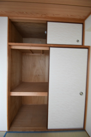 お部屋の各所には、用途に合わせた充実した収納スペースが用意されています。和室には大きな押入れが備わっており、布団や季節物の家電など、かさばる荷物もしっかりと収めることができます。洋室にはハンガーパイプと枕棚が設置されたクローゼットがあり、衣類をシワにすることなくきれいに整理できます。また、リビングダイニングの一角にも独立した収納スペースが設けられており、日用品や書類、掃除用具などを手の届きやすい場所にまとめて保管できるのが魅力です。住空間を最大限に広く使えるよう、効率的な収納レイアウトが整っています。