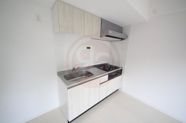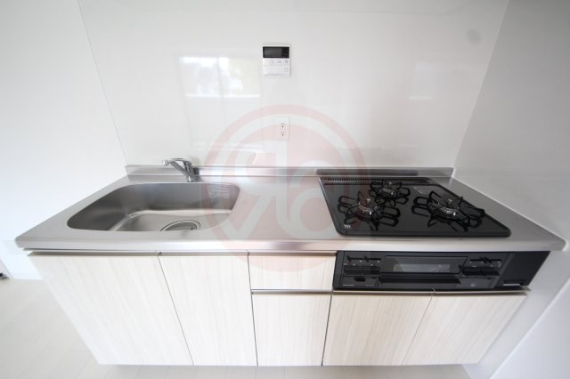 清潔感のある白いタイルと木目調のパネルが調和した、洗練されたデザインのシステムキッチンです。広々としたシンクの横には三口のガスコンロが完備されており、複数の料理を同時に進められるため、毎日の家事効率が格段にアップします。キッチンの上下には、調理器具や食器、ストック食材をたっぷりと収められる収納スペースが豊富に確保されており、常に片付いた綺麗な状態を保ちやすい設計です。手元を明るく照らす照明や、煙やニオイを効率的に吸い込む大型のレンジフードも備わっており、快適な調理環境が整えられています。リビングとの繋がりを感じられる配置でありながら、独立した作業スペースとしての使い勝手も追求されており、毎日の料理時間をより豊かなものに変えてくれるお部屋の魅力的なスポットです。