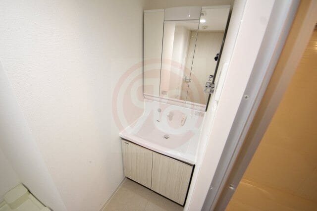 白を基調とした清潔感のある空間に、使い勝手の良い独立洗面台が設置されています。洗面台には三面鏡が採用されており、鏡の裏や下部の収納スペースに洗面道具や日用品をたっぷりと収められるため、生活感を出さずにすっきりと保つことが可能です。洗面ボウルは広々とした設計で、朝の洗顔や身支度もスムーズに行える実用的な造りになっています。すぐ横には洗濯機置き場が確保されており、脱いだ衣類をそのまま洗濯機へ入れられる効率的な動線が、日々の家事の負担を軽減してくれます。バスルームへの出入りもスムーズな機能的なレイアウトは、忙しい毎日の中にゆとりと快適さをもたらしてくれる大切な空間です。