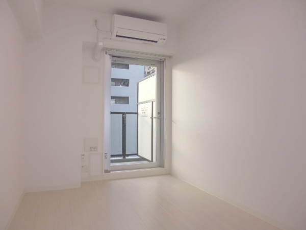洋室は7.88帖の広さがあり、白を基調とした内装と明るい色のフローリングが、開放感のある爽やかな住空間を演出しています。あらかじめエアコンが設置されているため、入居したその日から一年中快適な室温で過ごせるのが嬉しいポイントです。バルコニーに面した大きな掃き出し窓からは自然な光が差し込み、日中は照明をつけなくても心地よい明るさが保たれます。お部屋の一角にはクローゼットも完備されているため、衣類や生活用品をすっきりと収納して、居住スペースをより広く有効に活用することが可能です。