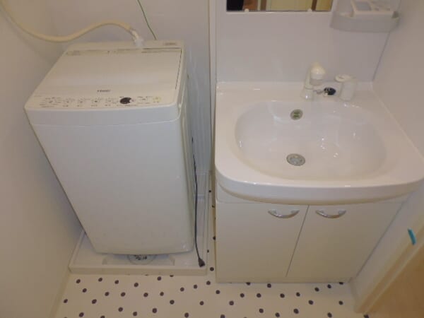 脱衣所は、毎日の身支度を効率的に行えるよう、独立洗面台と洗濯機置き場がスマートに配置されています。洗面台は大型の鏡を備えた洗髪洗面化粧台となっており、忙しい朝のヘアセットや身だしなみチェックも快適に行えるのが魅力です。洗面ボウル下や鏡の横には収納スペースが確保されているため、洗面用具やストック品をすっきりと整理して、清潔感のある空間を保てます。浴室の入り口に直結した動線となっており、着替えや洗濯の準備もスムーズにこなせる、使い勝手を追求した設計がなされています。