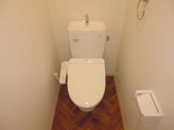 トイレは、温水洗浄便座が完備された、清潔感あふれる快適な個室空間となっています。ヘリンボーン調の床デザインがモダンなアクセントを加え、落ち着いた雰囲気を演出しているのが印象的です。上部には手洗い付きのタンクが備わっており、使用後すぐに手を洗える実用的な設計がなされています。壁面にはタオルハンガーやペーパーホルダーもしっかり設置されており、限られたスペースながらも心地よく使用できるよう配慮された、使い勝手の良い空間です。