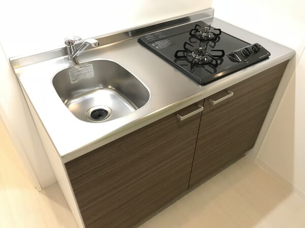キッチンは、木目調のデザインが空間に溶け込む、機能的なシステムキッチンが採用されています。自炊派に嬉しい2口のガスコンロが備わっており、メインのおかずとスープを同時に調理するなど、効率よくお料理を楽しめるのが魅力です。作業スペース上下の収納棚は、調味料や食器類を分類して整理するのに十分な容量があり、キッチン周りを常に整頓された状態に保てます。廊下部分に配置されたコンパクトで無駄のない設計ながら、毎日の家事動線をスムーズにサポートしてくれる使い勝手の良い構成となっています。