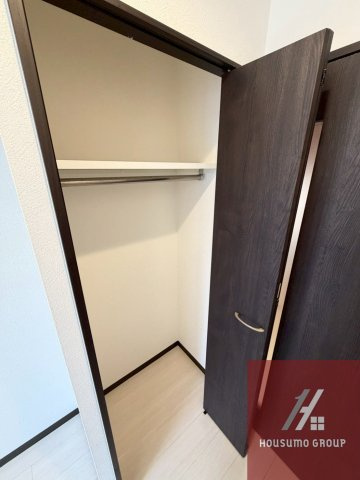 お部屋を常に美しく保つための、機能的な収納スペースが各所に確保されています。洋室には、ハンガーパイプと上部棚を備えたクローゼットが設置されており、衣類やファッション小物を効率よく整理することが可能です。玄関部分には、天井近くまで高さのあるトール型のシューズボックスが完備されているため、家族全員の靴をすっきりと収めて清潔感のある入り口を維持できます。さらに、廊下などにも物入れとして活用できるスペースがあり、日用品のストックや掃除用具などを手の届く場所にまとめて収納できる、使い勝手の良い設計が魅力です。