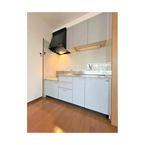 キッチンは、壁付けタイプの機能的なシステムキッチンを採用しており、背後にあるLDKのスペースを広々と効率的に活用できる設計が魅力です。お料理に集中しやすいだけでなく、上下には調理器具や食器類をたっぷりと収められる収納棚が完備されており、常にスッキリとした状態を保ちながらスマートに家事を進めることができます。複数のコンロを備えたガスコンロ対応仕様となっているため、煮込み料理や炒め物を同時に行えるなど、自炊を楽しみながら日々の暮らしをより豊かに彩ることが可能です。清潔感のあるタイル貼りの壁面は耐久性に優れ、サッと拭くだけでお手入れができる機能性とデザイン性を兼ね備えた、使うほどに愛着のわく調理空間を実現しています。
