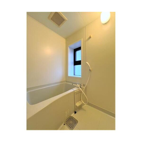 バスルームは、窓から自然光が差し込む明るく開放的な設計となっており、湿気がこもりにくく常に清潔な状態を保てるのが大きな魅力です。白を基調とした清潔感あふれる内装が、日々の疲れを優雅に癒やすリラックスタイムをより上質なものへと演出してくれます。ゆったりと浸かれる広めの浴槽を完備しているため、足を伸ばしてくつろげるほか、窓による換気効率の良さがカビの発生を抑え、お手入れのしやすさを向上させています。機能的なシャワー設備と明るい照明が調和した機能美あふれる空間は、住む人の心地よさを追求した快適なサニタリー環境を実現しています。