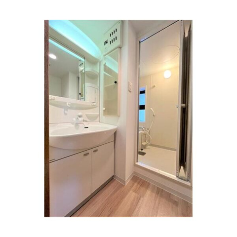 洗面脱衣所には、忙しい朝の身支度をスムーズにサポートする独立洗面化粧台が完備されており、清潔感のある白を基調としたデザインが空間を明るく演出しています。鏡の両サイドには小物を整理しやすい収納トレーが備わっているほか、洗面ボウル下部にはお掃除用品やストック類を効率よく収められる扉付きの収納スペースが確保されているのが魅力です。シャワーヘッド付きの洗髪洗面化粧台を採用しているため、お掃除がしやすいだけでなく、洗顔やヘアセットも快適に行える高い機能性を備えています。バスルームへ続く動線上に洗濯機置き場も配置された無駄のないレイアウトにより、家事効率を高めながら心地よい毎日を過ごせる実用的なサニタリー環境が整っています。