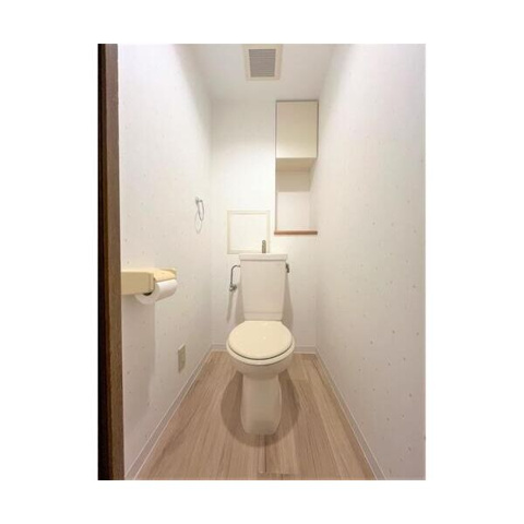 トイレは、清潔感のある白を基調とした内装で、毎日の生活に快適さをもたらす温水洗浄便座を標準装備した機能的な空間となっています。手洗い一体型のタンクを採用したスマートなデザインにより、限られたスペースを有効に活用しながら、日々の衛生管理とお掃除をスムーズに行えるのが魅力です。奥の壁面にはトイレットペーパーや掃除用品などをスッキリと整理できる便利な収納棚が備わっており、生活感を抑えて常に整った状態を保つことができます。温かみのある木目調のフロアと、さりげないドット柄のアクセントクロスが調和したモダンな雰囲気が、住む人に心地よい安らぎを感じさせてくれるサニタリースペースです。