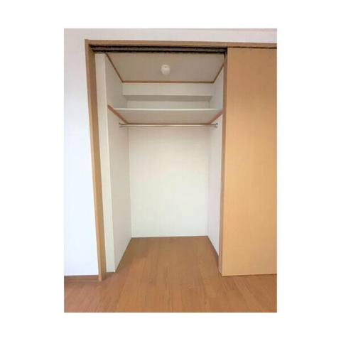 洋室には、衣類や日用品を効率よく整理できる大容量のクローゼットが完備されており、居住スペースを常にスッキリとした状態に保つことができます。上下に空間を仕切れる棚板が備わっているため、ハンガーパイプに掛ける衣類と、上部の棚に置く季節物の荷物を分けて、ライフスタイルに合わせて無駄なく収納できる機能性の高さが魅力です。全居室に収納を確保した充実の設備内容により、二人入居や荷物の多い方でも居住スペースを最大限に広く使いながら、心地よい毎日を過ごせます。木目調の扉がインテリアに馴染む落ち着いたデザインとなっており、お部屋の美観を損なうことなく、住む人の使い心地に寄り添った収納環境を実現しています。